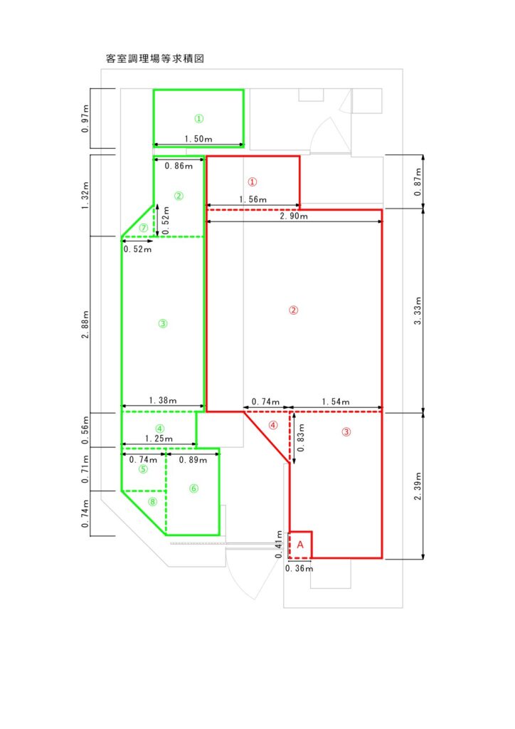 • 正確な求積計算:客室、調理場など営業所内を1mmの誤差なく区分。複雑な形状の店舗でも、計算根拠を明確に示した図面で警察担当者の確認をスムーズにします。